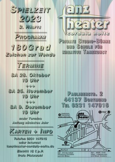 Karten: Vorbestellung ab sofort hier online tanztheater-cordula-nolte.de/k... oder telefonisch jederzeit auf Anrufbeantworter: 0231 147916 Eintritt: p.P. 15€ (freie Platzwahl)