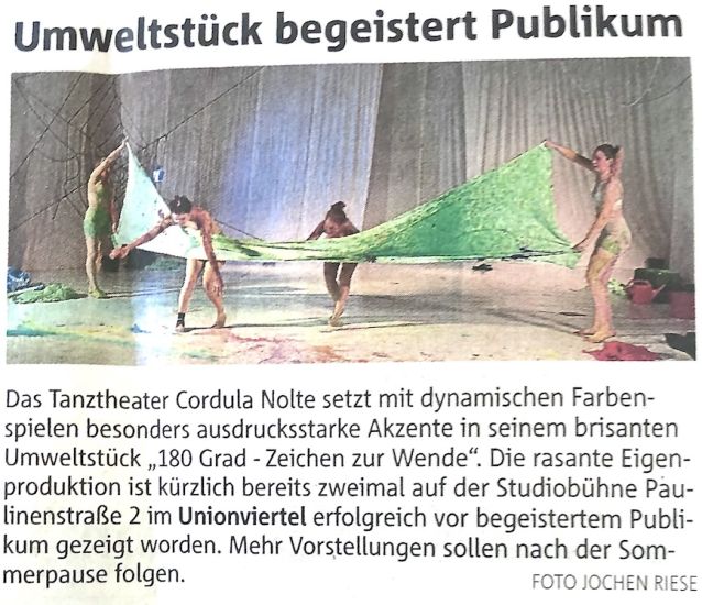 Mit großer Publikumsresonanz war „180 Grad“ zweimal schon vor der Sommerpause zu sehen. Bei der Premiere am 7. Mai und dann noch einmal am 14. Mai war die eigene Studiobühne des freien Ensembles bis auf den letzten Platz besetzt. Für beide Vorstellungen gab’s begeistert Beifall und Jubel. Anerkennung fand das Umweltstück auch in der Presse. (siehe hier unten) Jetzt geht‘s weiter in der 2. Hälfte der Spielzeit mit drei Vorstellungen zunächst bis Jahresende