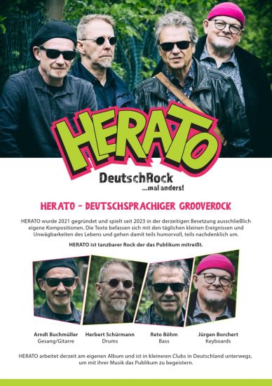 HERATO ist tanzbarer Rock der das Publikum mitreißt. HERATO arbeitet derzeit am eigenen Album und ist in kleineren Clubs in Deutschland unterwegs, um mit ihrer Musik das Publikum zu begeistern.