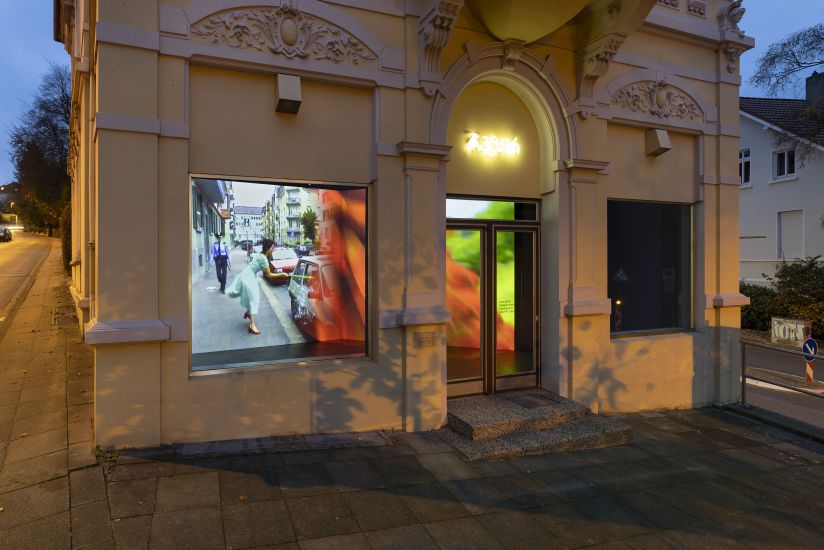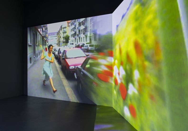 Blume über einen Bürgersteig schreitet. Die rechte Projektion zeigt eine wilde Kamerafahrt