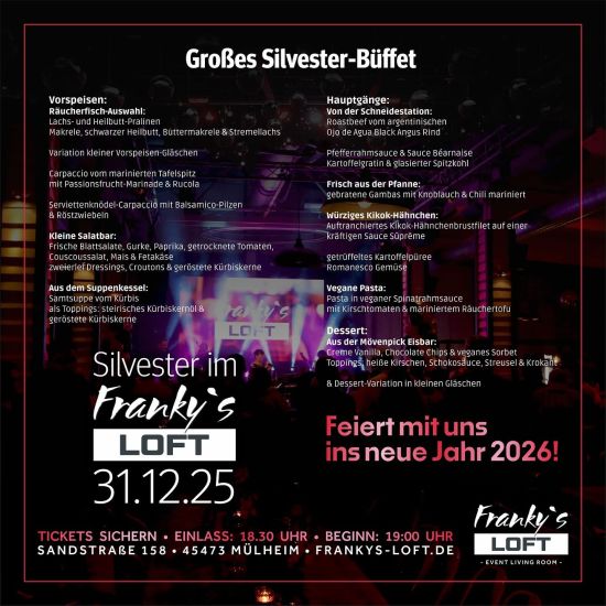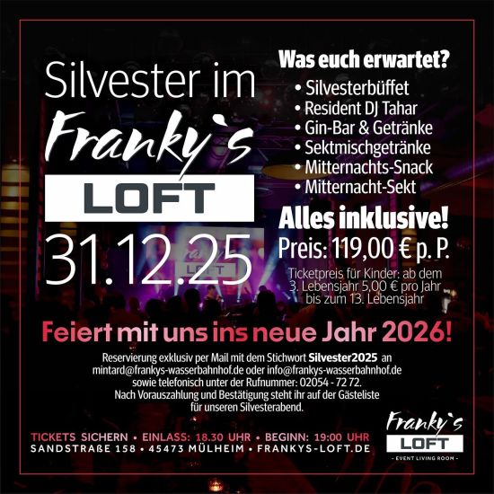 Feiert mit uns die legendäre Silvesternacht im frisch modernisierten Franky’s LOFT und stoßt gemeinsam mit uns auf ein grandioses 2026 an.