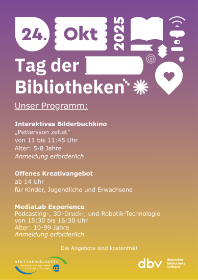 Von Bilderbuchkino über Kreativangebote bis hin zu Robotik und 3D-Druck: Am Tag der Bibliotheken gibt es bei uns viel zu entdecken!