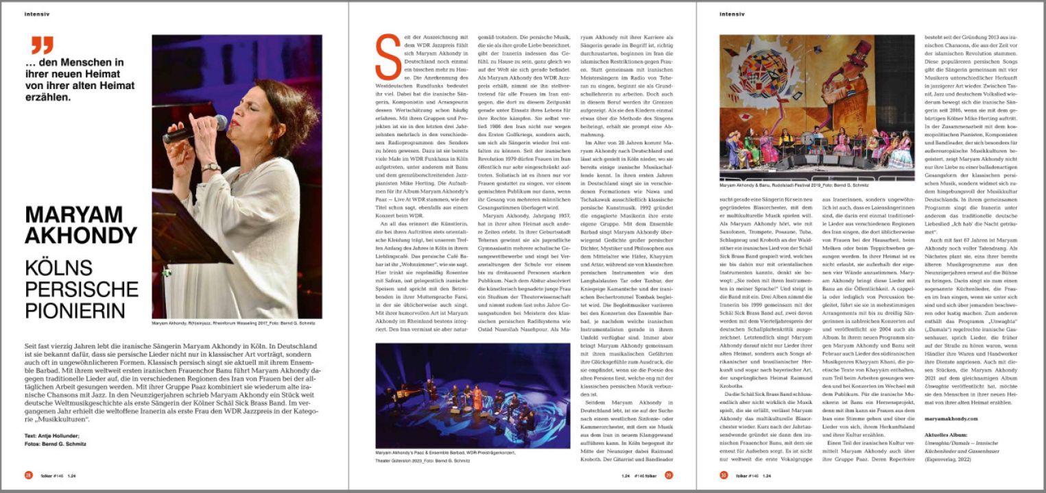Als Sängerin und Initiatorin von Musikprojekten ist Maryam Akhondy eine der vielseitigsten iranischen Musikschaffenden. Von 1995 bis 1999 war sie die Stimme des Kölner Weltmusikorchesters „Schäl Sick Brass Band“ und verband mit diesem erstmals persische Texte mit westlichen Klängen. Für die mit Maryam Akhondy aufgenommenen Alben „Majnoun“ und „Tschupun“ wurde die Band für den Preis der Deutschen Schallplattenkritik nominiert. Eine vom Goethe-Institut organisierte Tournee führte Akhondy 2004 mit der Musikgruppe in den Libanon, nach Syrien, Jordanien, Palästina und Ägypten.
