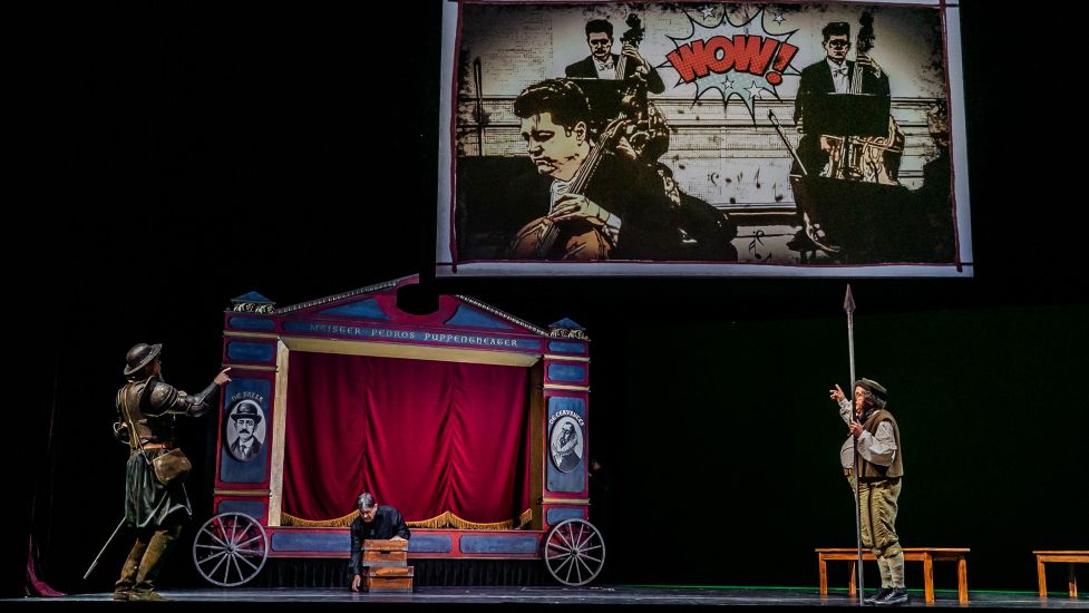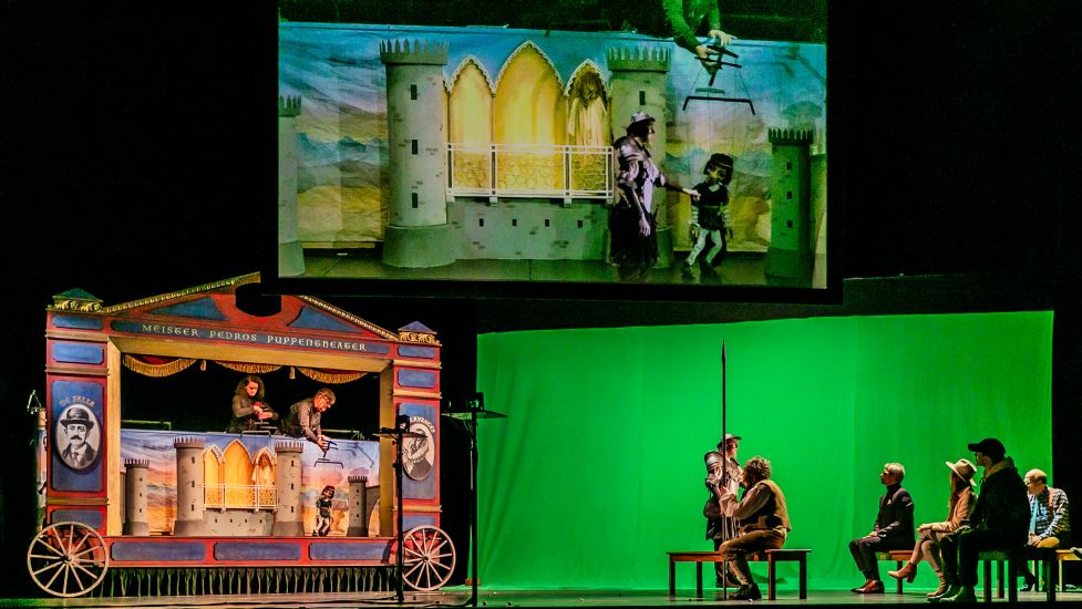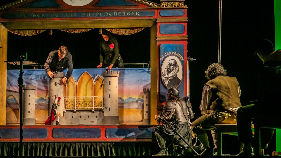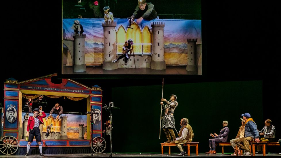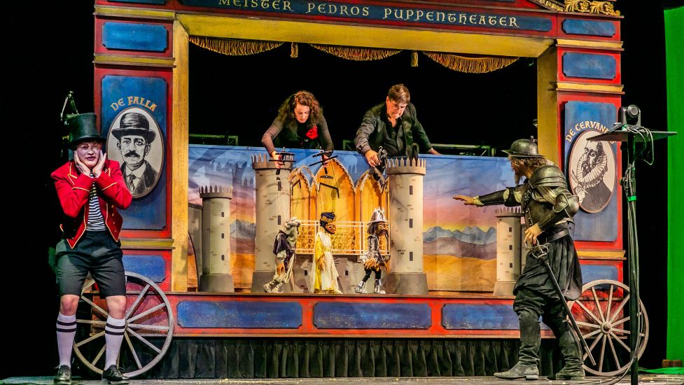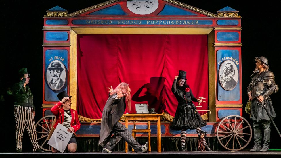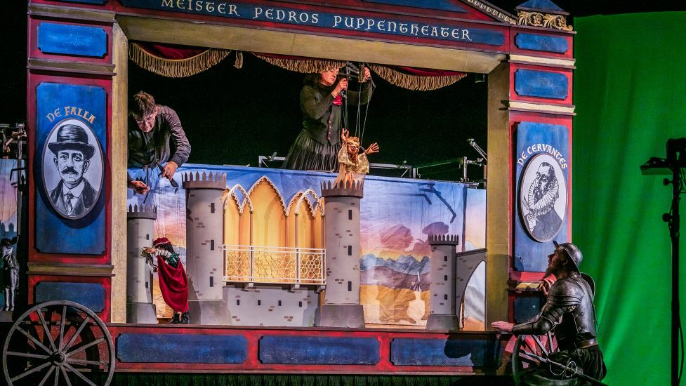 As early as the prologue, Don Quijote and his faithful friend Sancho Panza experience all manner of adventures on and with the stage – windmills included – in this family-friendly production by Ilaria Lanzino and Torge Möller (fettfilm). This one-act opera by the Spanish composer Manuel de Falla (1876 – 1946) is a charming chamber piece, a play within a play, with the internationally renowned Düsseldorfer Marionetten-Theater bringing the story of Maestro Pedro’s travelling theatre to life until Don Quijote leaps directly onto the puppet stage with the help of live video and a little magic!