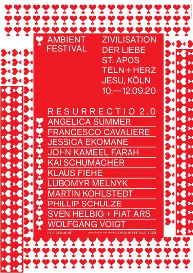 Nachdem das 12. Ambientfestival im März Corona-bedingt abgesagt werden musste, freuen wir uns um so mehr, dass es nun vom 10. - 12. September mit modifiziertem Programm, einigen neuen Künstler*innen und ausgedehnt auf zwei Kirchen - St. Aposteln und Herz Jesu - stattfinden kann.